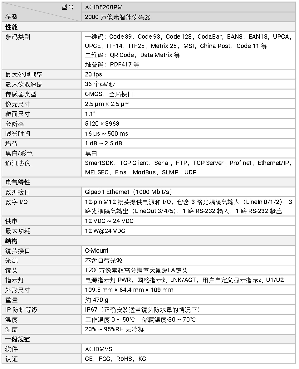 功能特性选用20MP 高性能全局快门Sensor,图像质量优异内置深度学习读码算法,可适应多种复杂工况,鲁棒性强支持TCP/IP、Serial、FTP、Profinet、Ethernet/IP、MELSEC、Fins 等通讯协议支持棋盘格ROI,可同时读取200 个二维码IP67 防护,无惧严苛的工业应用环境